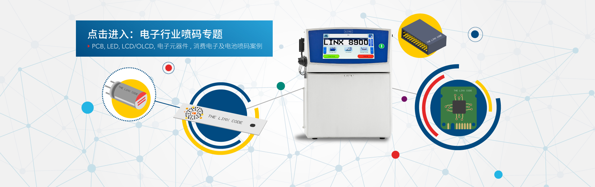 Linx連續(xù)噴墨噴碼機(jī)可為苛刻生產(chǎn)環(huán)境中的電子元器件提供可靠的產(chǎn)品標(biāo)識(shí)碼。標(biāo)碼高度低至 1.4 毫米 (CIJ) 和 0.8 毫米。